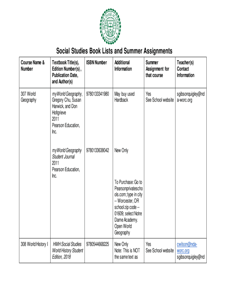 Social Studies Book Lists and Summer Assignments Course Name & NumberTextbook Title(s), Edition Number(s), Publication Date, and Author(s)ISBN NumberAdditional Information Summer Assignment for that