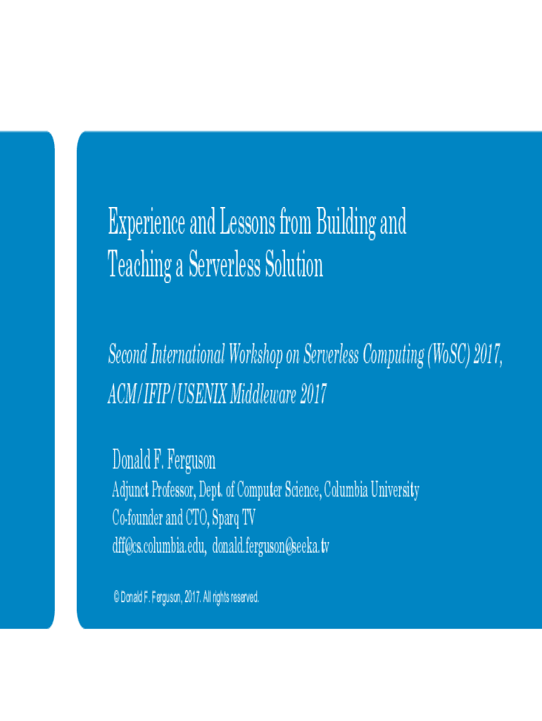 Experience and Lessons from Building and Teaching a Serverless Solution Second International Workshop on Serverless Computing (Wisc) 2017, ACM/FIP/UNIX Middleware 2017 Donald F. FergusonAdjunct Professor,