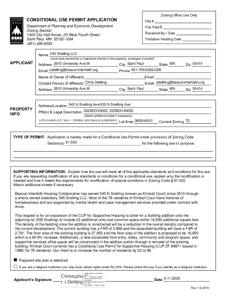 ZONING COMMITTEE STAFF REPORT 1. FILE NAME: Kimball Court Supportive Housing Expansion 2. APPLICANT: 545 Selling LUCILE # 20046445 HEARING DATE: July 30, 20203. TYPE OF APPLICATION: Conditional Use