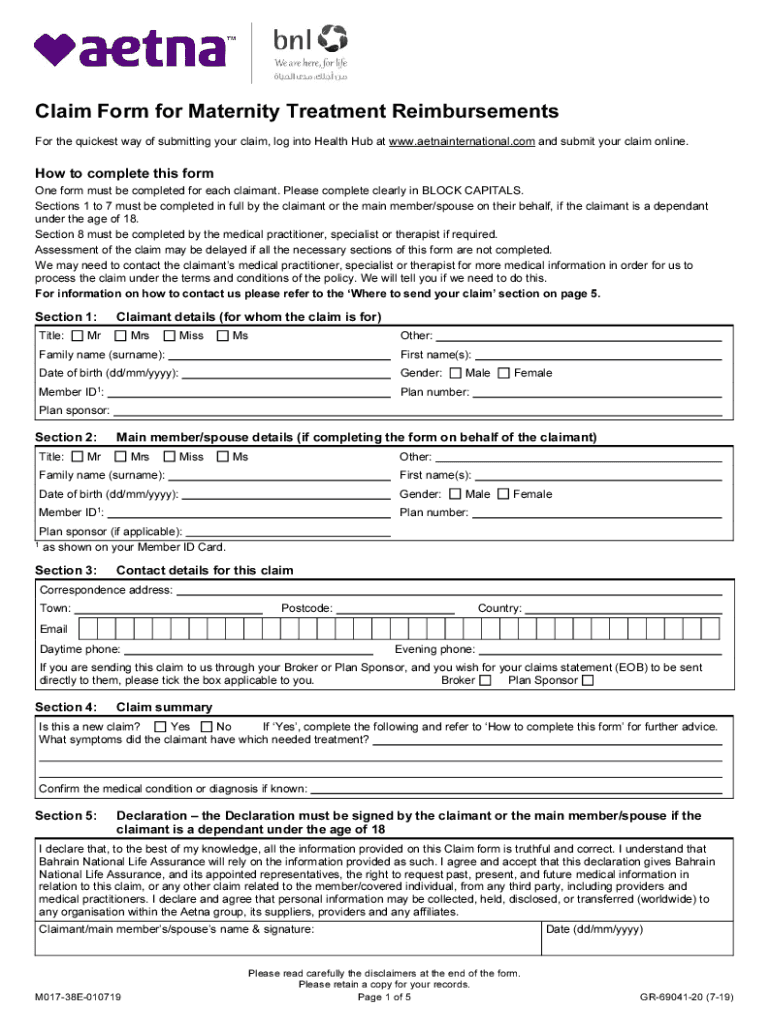 Claim Form for Maternity Treatment Reimbursements For the quickest way of submitting your claim, log into Health Hub at www.aetnainternational.com and submit your claim online. How to complete this