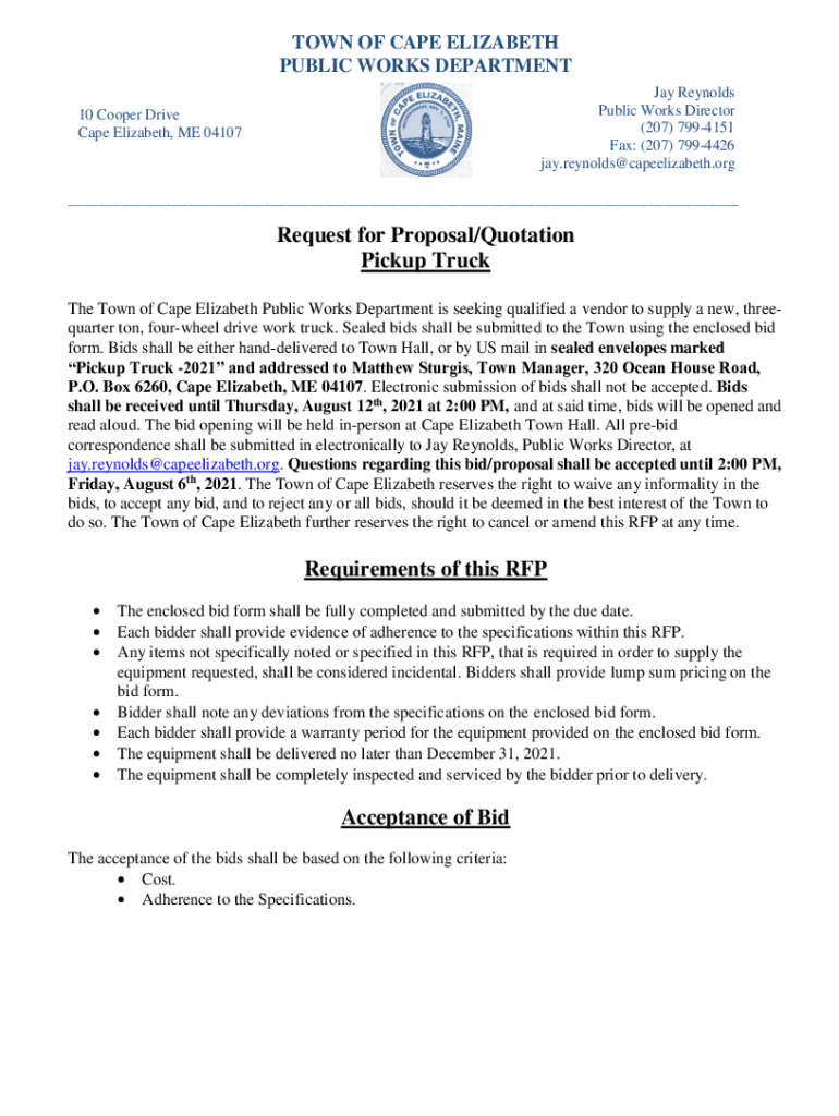TOWN OF CAPE ELIZABETH PUBLIC WORKS DEPARTMENT Jay Reynolds Public Works Director (207) 7994151 Fax: (207) 7994426 jay.reynolds@capeelizabeth.org10 Cooper Drive Cape Elizabeth, ME 04107___Request