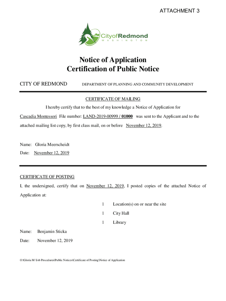 Get the free Notice of Application Certification of Public Notice - redmond.gov