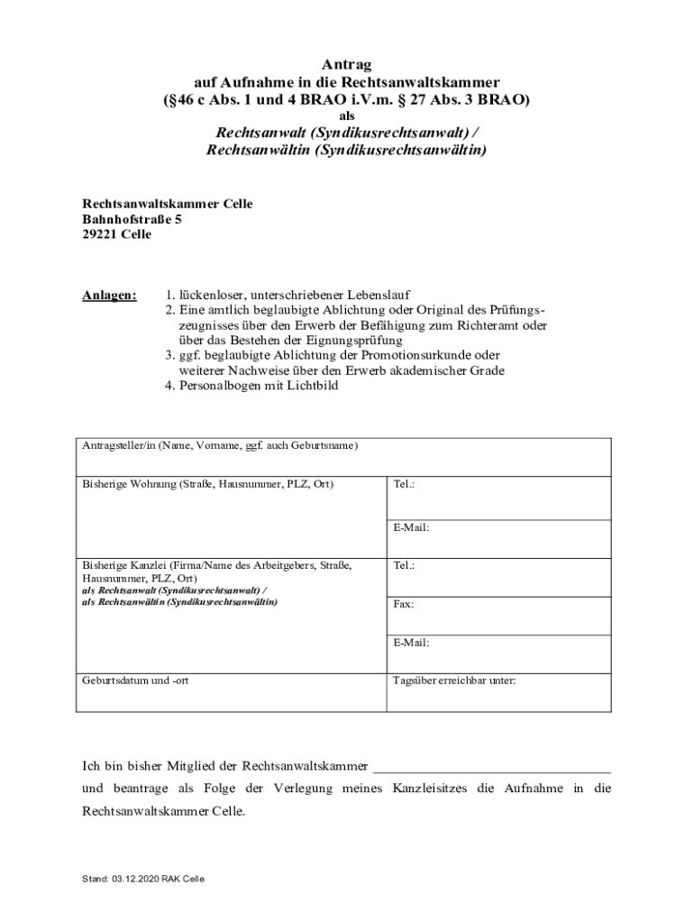 Get the free Antrag auf Aufnahme in die Rechtsanwaltskammer (46 c Abs. 1 und 4 BRAO ...