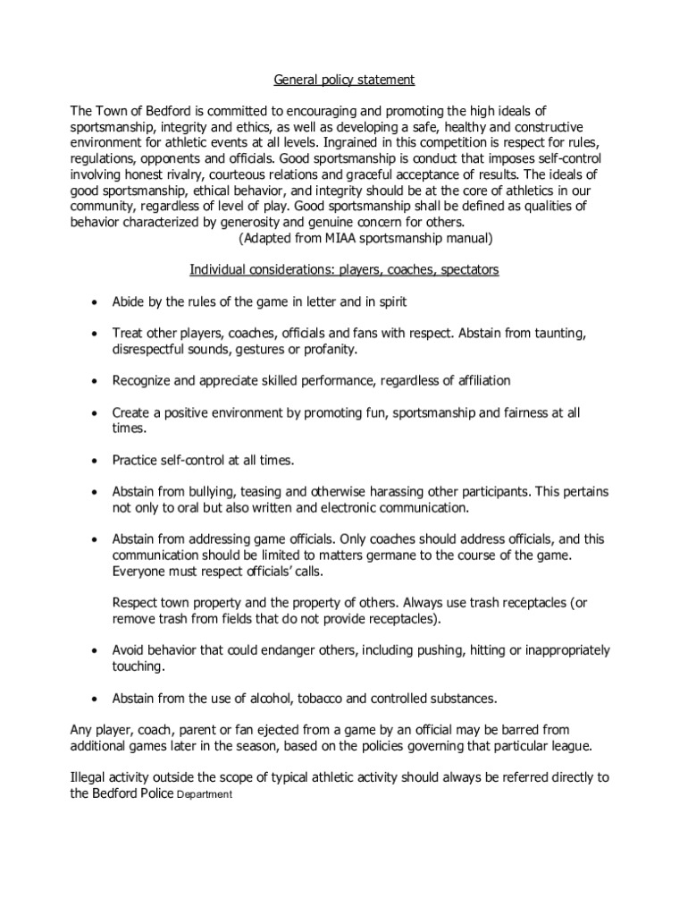 General policy statement The Town of Bedford is committed to encouraging and promoting the high ideals of sportsmanship, integrity and ethics, as well as developing a safe, healthy and constructive