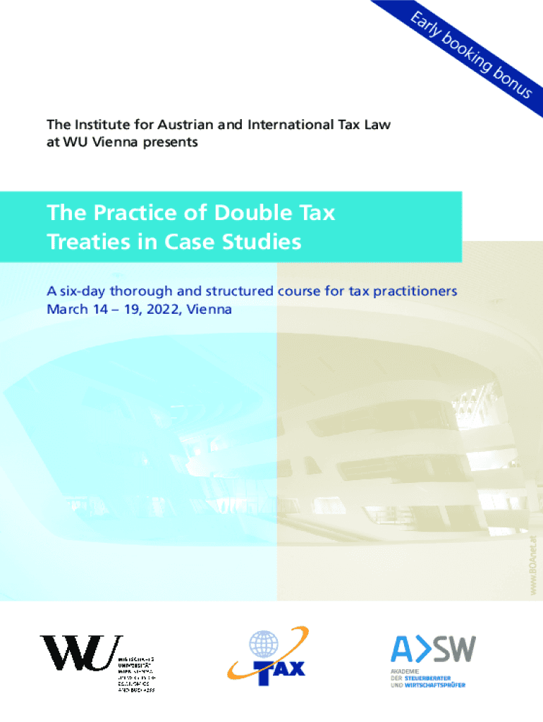 The Institute for Austrian and International Tax Law at WU Vienna presents Practice of Double Tax Treaties in Case Studies A six-day thorough and structured course for tax practitioners March 14 19,