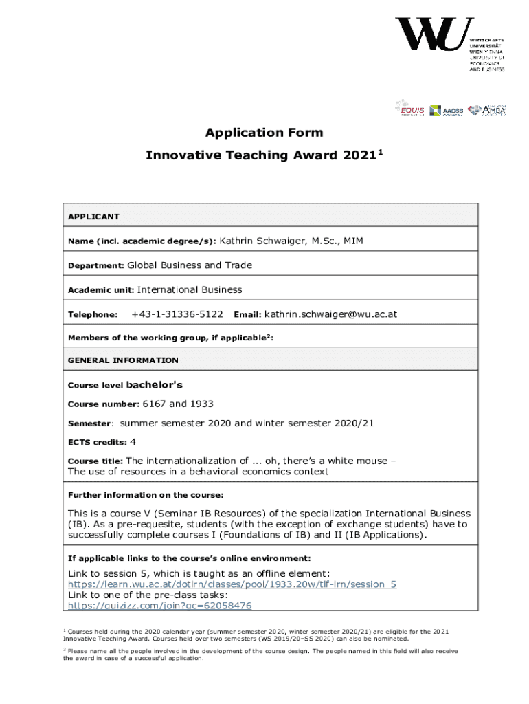 Application Form Innovative Teaching Award 20211APPLICANT Name (incl. academic degree/s): Kathryn Schweitzer, M.Sc., MIM Department: Global Business and Trade Academic unit: International Business