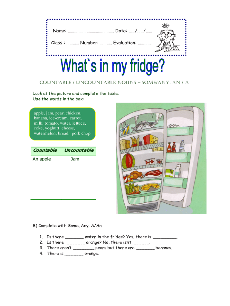 Name:. Date: // Class : Number:. Evaluation:. Countable / uncountable nouns Some/Any, An / A Look at the picture and complete the table: Use the words in the box:apple, jam, pear, chicken, banana,