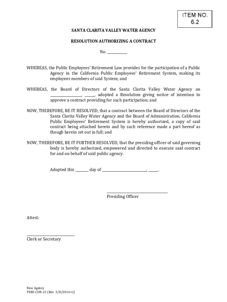 SANTA CLARITA VALLEY WATER AGENCY RESOLUTION AUTHORIZING A CONTRACT No. ___WHEREAS, the Public Employees\' Retirement Law provides for the participation of a Public Agency in the California Public