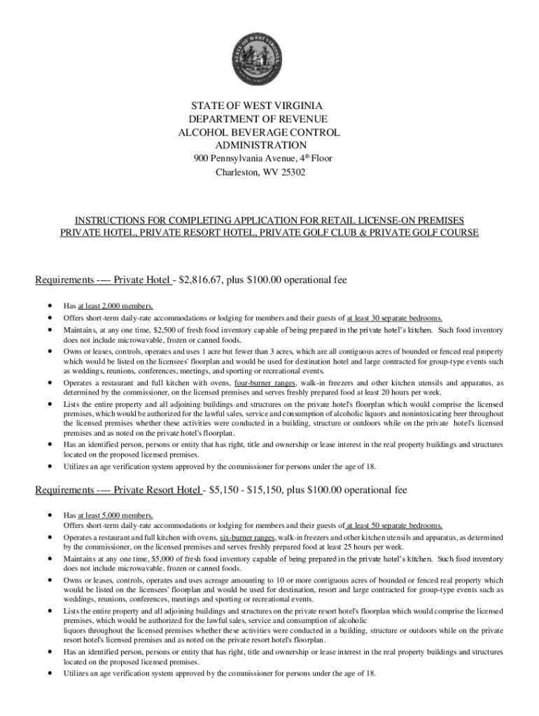 STATE OF WEST VIRGINIA DEPARTMENT OF REVENUE ALCOHOL BEVERAGE CONTROL ADMINISTRATION 900 Pennsylvania Avenue, 4th Floor Charleston, WV 25302INSTRUCTIONS FOR COMPLETING APPLICATION FOR RETAIL LICENSE