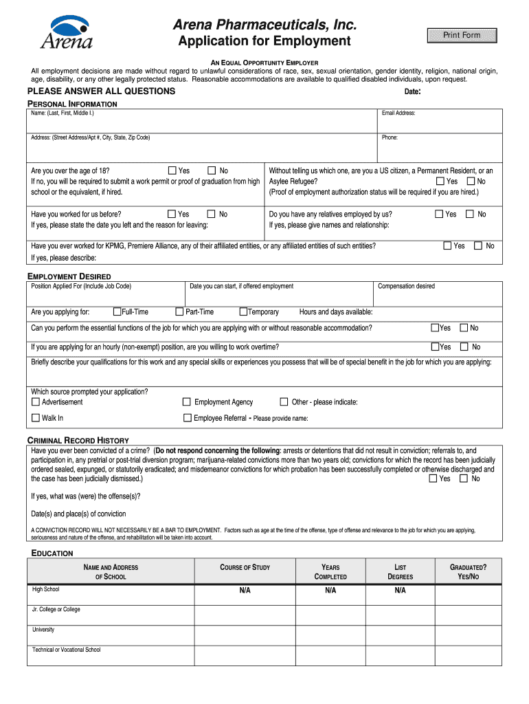Arena Pharmaceuticals, Inc. Print Form Application for Employment AN EQUAL OPPORTUNITY EMPLOYER All employment decisions are made without regard to unlawful considerations of race, sex, sexual orientation,
