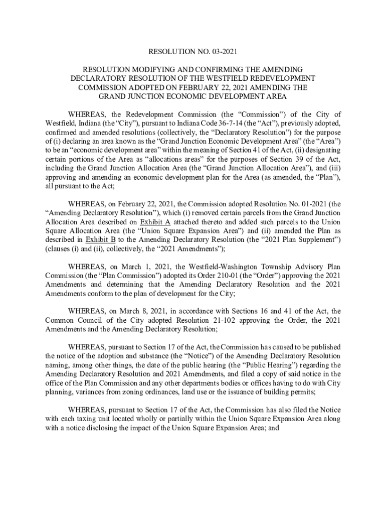 RESOLUTION NO. 032021 RESOLUTION MODIFYING AND CONFIRMING THE AMENDING DECLARATORY RESOLUTION OF THE WESTFIELD REDEVELOPMENT COMMISSION ADOPTED ON FEBRUARY 22, 2021, AMENDING THE GRAND JUNCTION ECONOMIC
