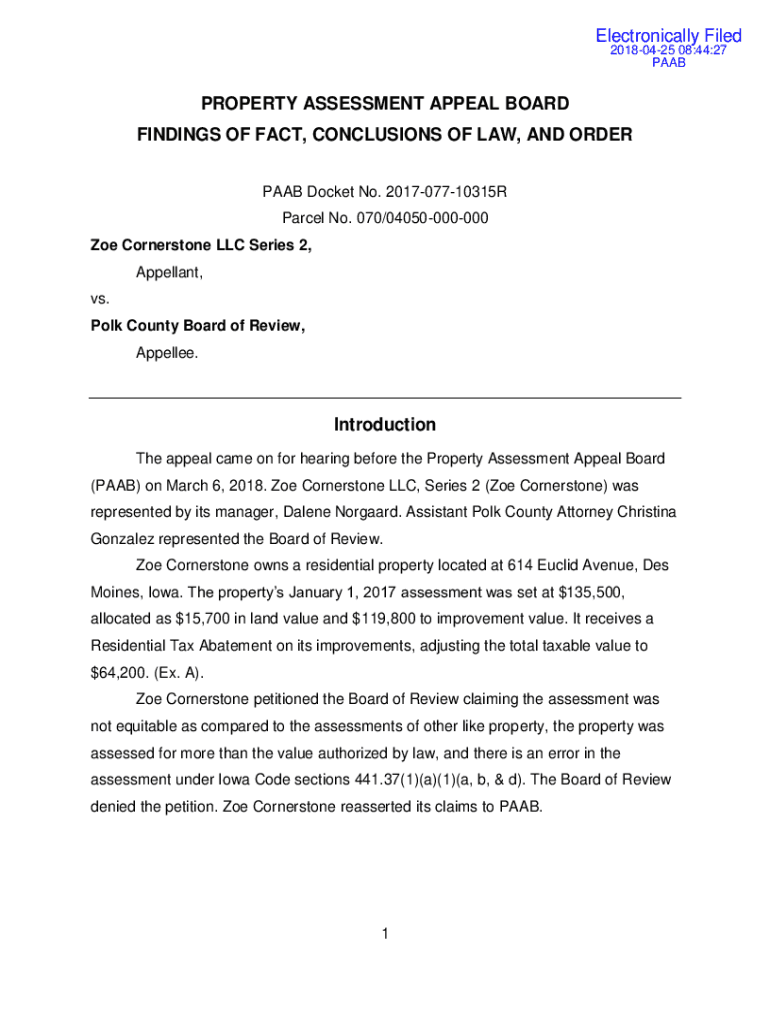 Electronically Filed 20180425 08:44:27 PAABPROPERTY ASSESSMENT APPEAL BOARD FINDINGS OF FACT, CONCLUSIONS OF LAW, AND ORDER SAAB Docket No. 201707710315R Parcel No. 070/04050000000 Zoe Cornerstone