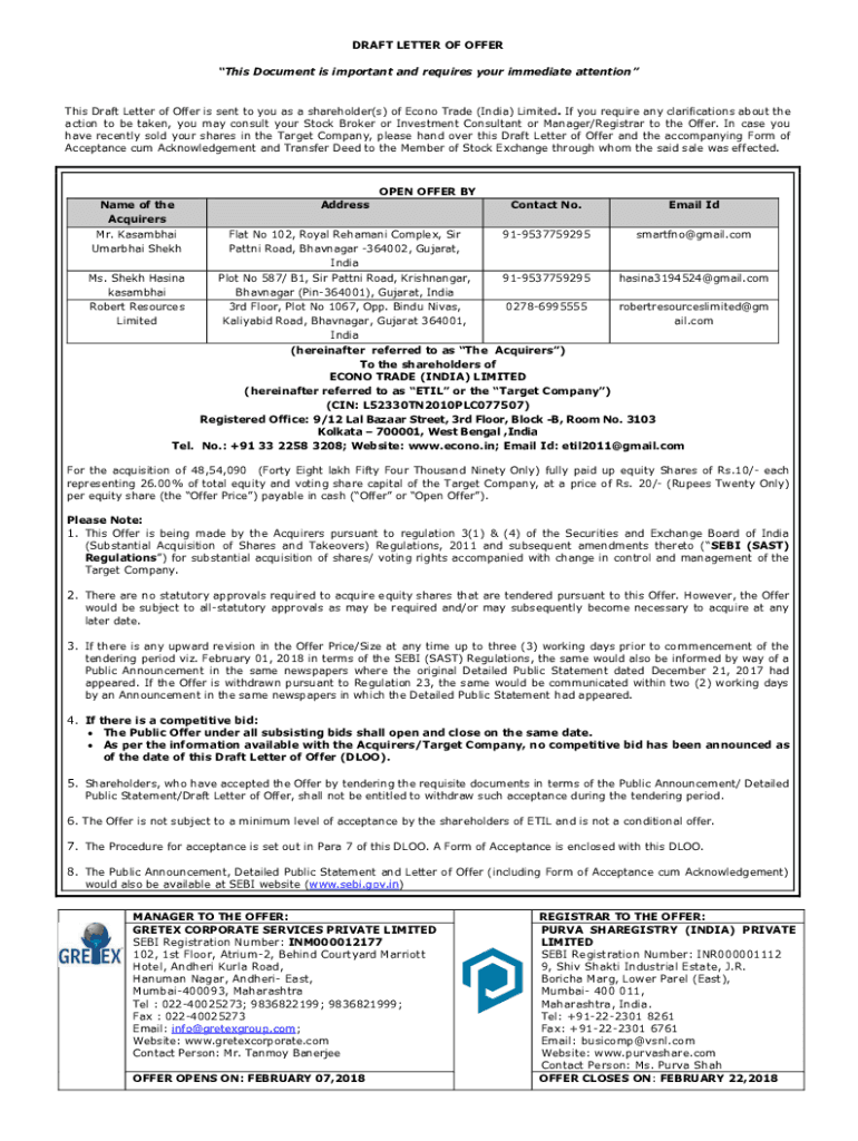 DRAFT LETTER OF OFFER This Document is important and requires your immediate attentions Draft Letter of Offer is sent to you as a shareholder(s) of Econ Trade (India) Limited. If you require any clarifications