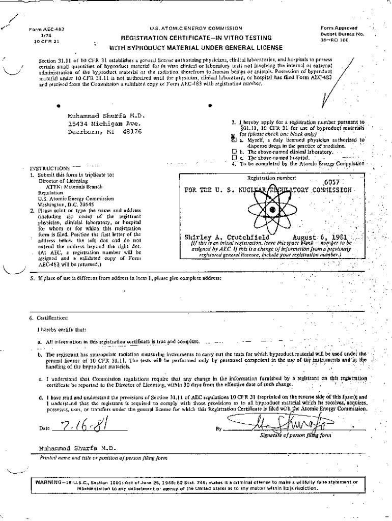 Form Approved Budget Bureau No. 38RO 160U. S. ATOMIC ENERGY Commissioner AEC483 1/74 10 CFR 31REGISTRATION CERTIFICATE IN VITO TESTING WITH BYPRODUCT MATERIAL UNDER GENERAL LICENSESection 31.11 of