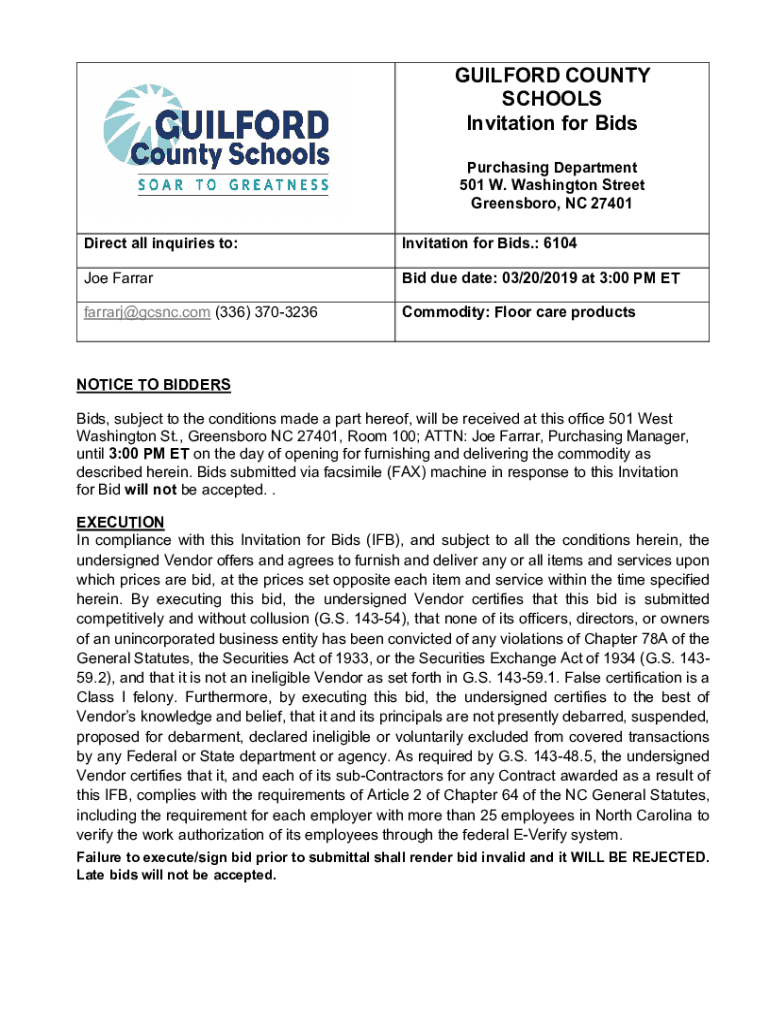 GUILFORD COUNTY SCHOOLS Invitation for Bids Purchasing Department 501 W. Washington Street Greensboro, NC 27401 Direct all inquiries to:Invitation for Bids.: 6104Joe Ferrari due date: 03/20/2019 at