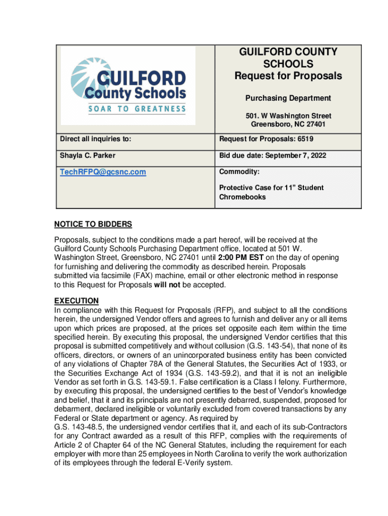 GUILFORD COUNTY SCHOOLS Request for Proposals Purchasing Department 501. W Washington Street Greensboro, NC 27401 Direct all inquiries to:Request for Proposals: 6519Shayla C. Parker due date: September