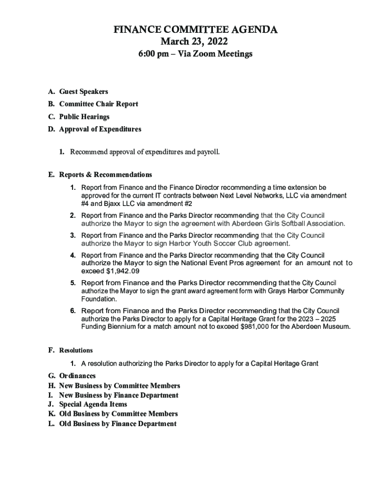 FINANCE COMMITTEE AGENDA March 23, 2023 6:00 pm Via Zoom Meetings. Guest Speakers B. Committee Chair Report C. Public Hearings D. Approval of Expenditures 1. Recommend approval of expenditures and