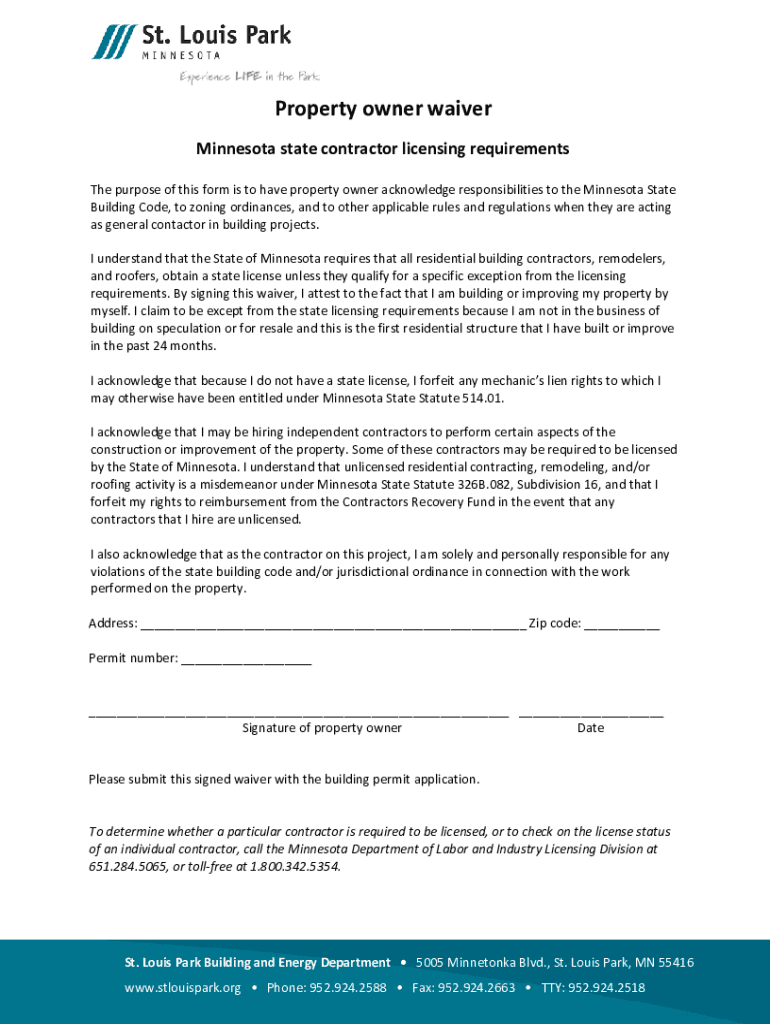 Property owner waiver Minnesota state contractor licensing requirements The purpose of this form is to have property owner acknowledge responsibilities to the Minnesota State Building Code, to zoning