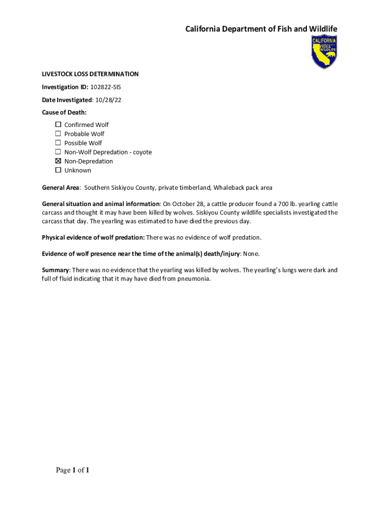 California Department of Fish and WildlifeLIVESTOCK LOSS DETERMINATION Investigation ID: 102822SIS Date Investigated: 10/28/22 Cause of Death:General Area: Southern Miskito County, private timberland,