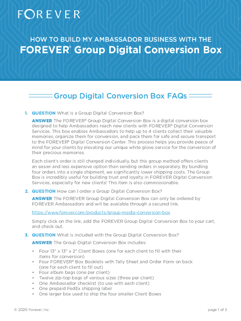 HOW TO BUILD MY AMBASSADOR BUSINESS WITH FOREVER Group Digital Conversion Group Digital Conversion Box FAQs 1.QUESTION What is a Group Digital Conversion Box? ANSWER The FOREVER Group Digital Conversion