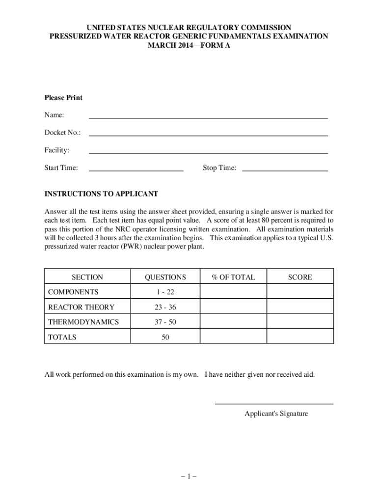 UNITED STATES NUCLEAR REGULATORY COMMISSION PRESSURIZED WATER REACTOR GENERIC FUNDAMENTALS EXAMINATION MARCH 2014FORM Please Print Name: Docket No.: Facility: Start Time:Stop Time:INSTRUCTIONS TO