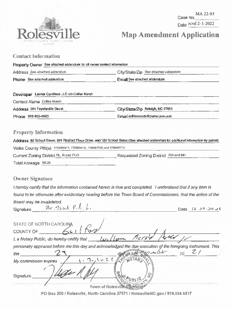 MA 2203 RCD 212022See attached Exhibit A to School Street Rezoning Application Property and Owner Contact Information Wake County PIN: Address: Current Zoning District: Requested Zoning District: