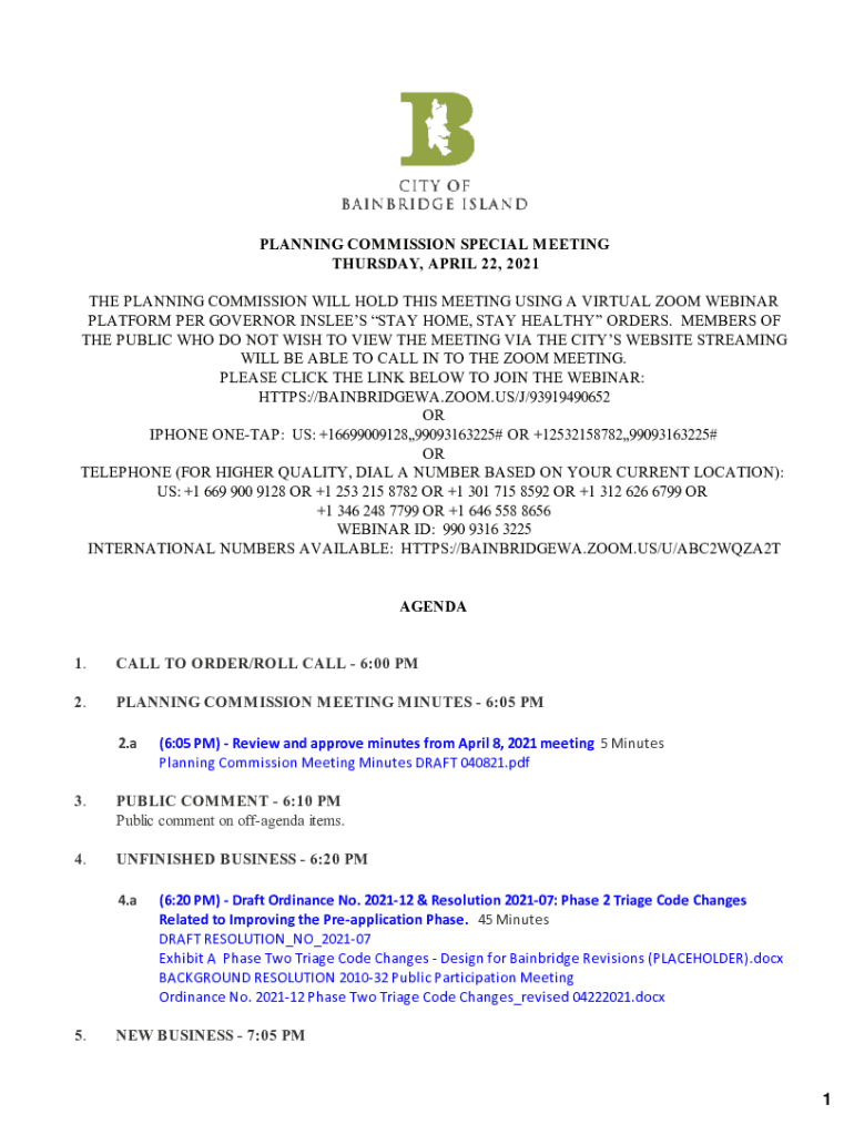 PLANNING COMMISSION SPECIAL MEETING THURSDAY, APRIL 22, 2021, THE PLANNING COMMISSION WILL HOLD THIS MEETING USING A VIRTUAL ZOOM WEBINAR PLATFORM PER GOVERNOR INSLEE STAY HOME, STAY HEALTHY ORDERS.
