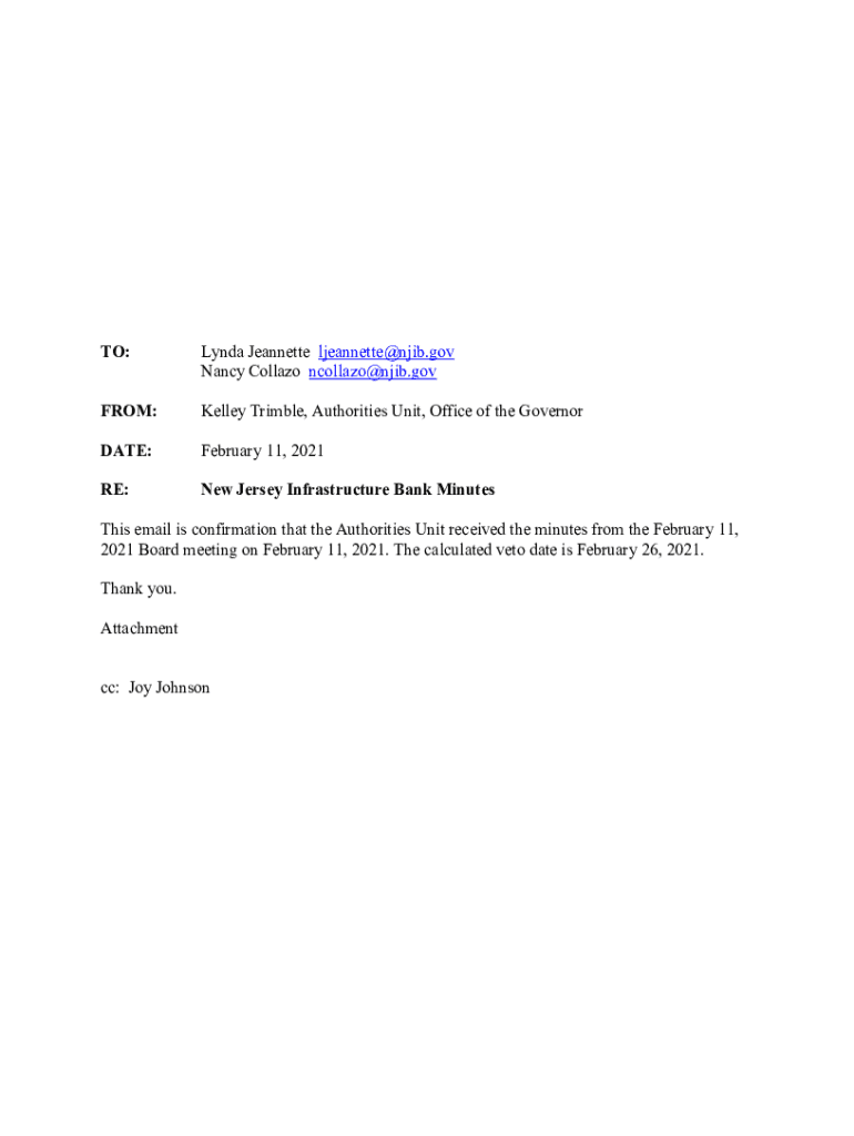 TO:Lynda Jeannette ljeannette@njib.gov Nancy Collar ncollazo@njib.govFROM:Kelley Trimble, Authorities Unit, Office of the Governorate:February 11, 2021RE:New Jersey Infrastructure Bank Minutes This