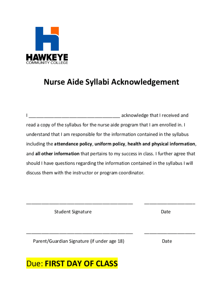 Nurse Aide Syllabi Acknowledgement ___ acknowledge that I received and read a copy of the syllabus for the nurse aide program that I am enrolled in. I understand that I am responsible for the information