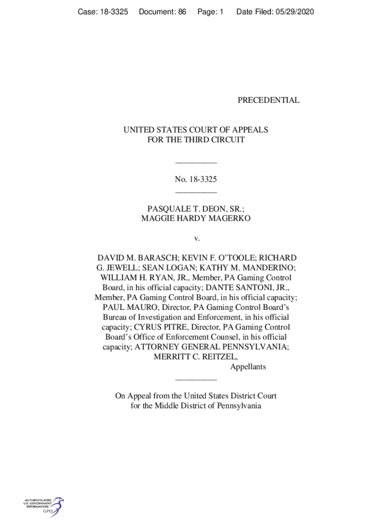 Case: 183325Document: 86Page: 1Date Filed: 05/29/2020PRECEDENTIALUNITED STATES COURT OF APPEALS FOR THE THIRD CIRCUIT ___ No. 183325 ___ PASQUALE T. DEON, SR.; MAGGIE HARDY MAGENTO v. DAVID M. BRANCH;