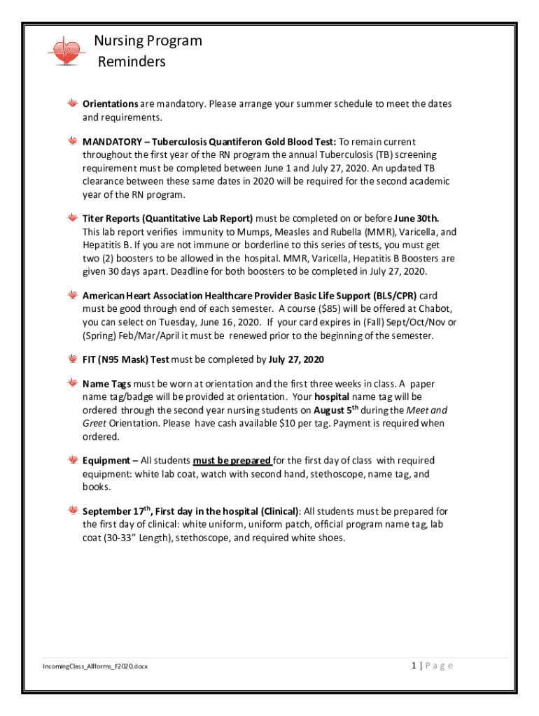 Nursing Program Reminders Orientations are mandatory. Please arrange your summer schedule to meet the dates and requirements. MANDATORY Tuberculosis Quantifier Gold Blood Test: To remain current throughout