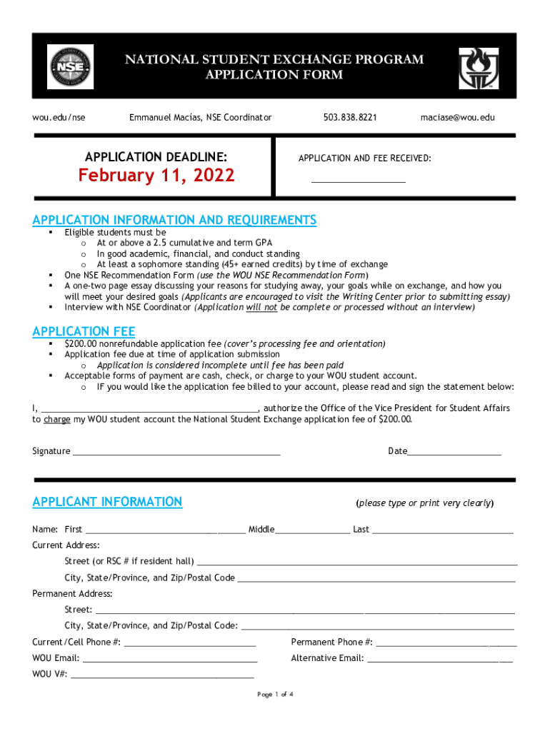 NATIONAL STUDENT EXCHANGE PROGRAM APPLICATION FORM wou.edu/nse503.838.8221Emmanuel Macaws, USE CoordinatorAPPLICATION DEADLINE:maciase@wou.application AND FEE RECEIVED:February 11, 2023___APPLICATION