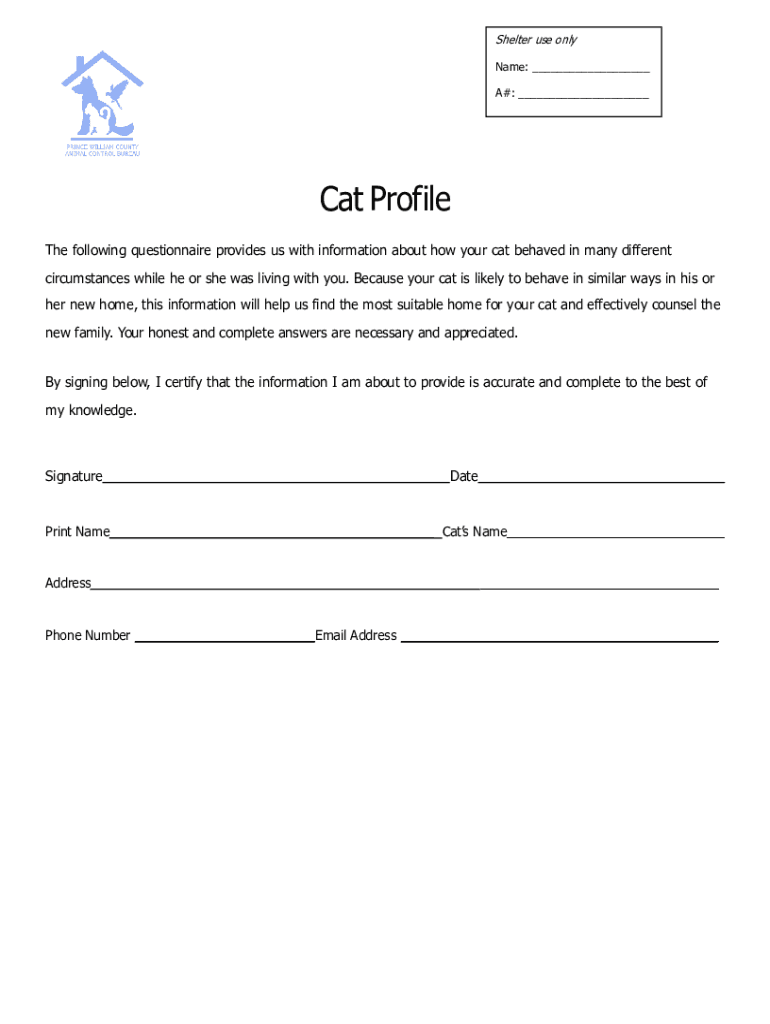 Shelter uses only Name: ___ A#: ___Cat Profile The following questionnaire provides us with information about how your cat behaved in many circumstances while he or she was living with you. Because