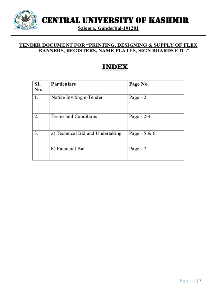 CENTRAL UNIVERSITY OF KASHMIR Saloon, Ganderbal191201 ___TENDER DOCUMENT FOR PRINTING, DESIGNING & SUPPLY OF FLEX BANNERS, REGISTERS, NAME PLATES, SIGN BOARDS ETC.INDEX SI. No. Particulars Page No.1.