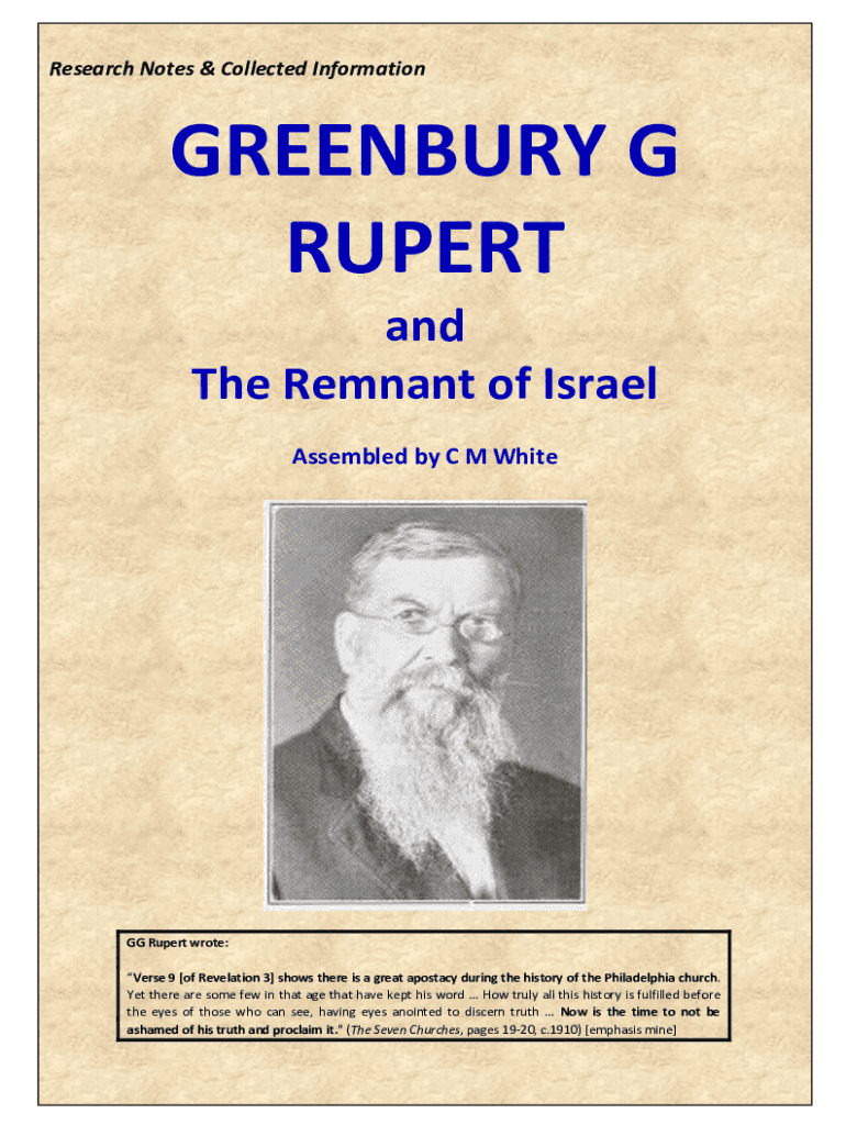 Research Notes & Collected InformationGREENBURY G RUPERT and The Remnant of Israel Assembled by C M White GG Rupert wrote: Verse 9 [of Revelation 3] shows there is a great apostasy during the history