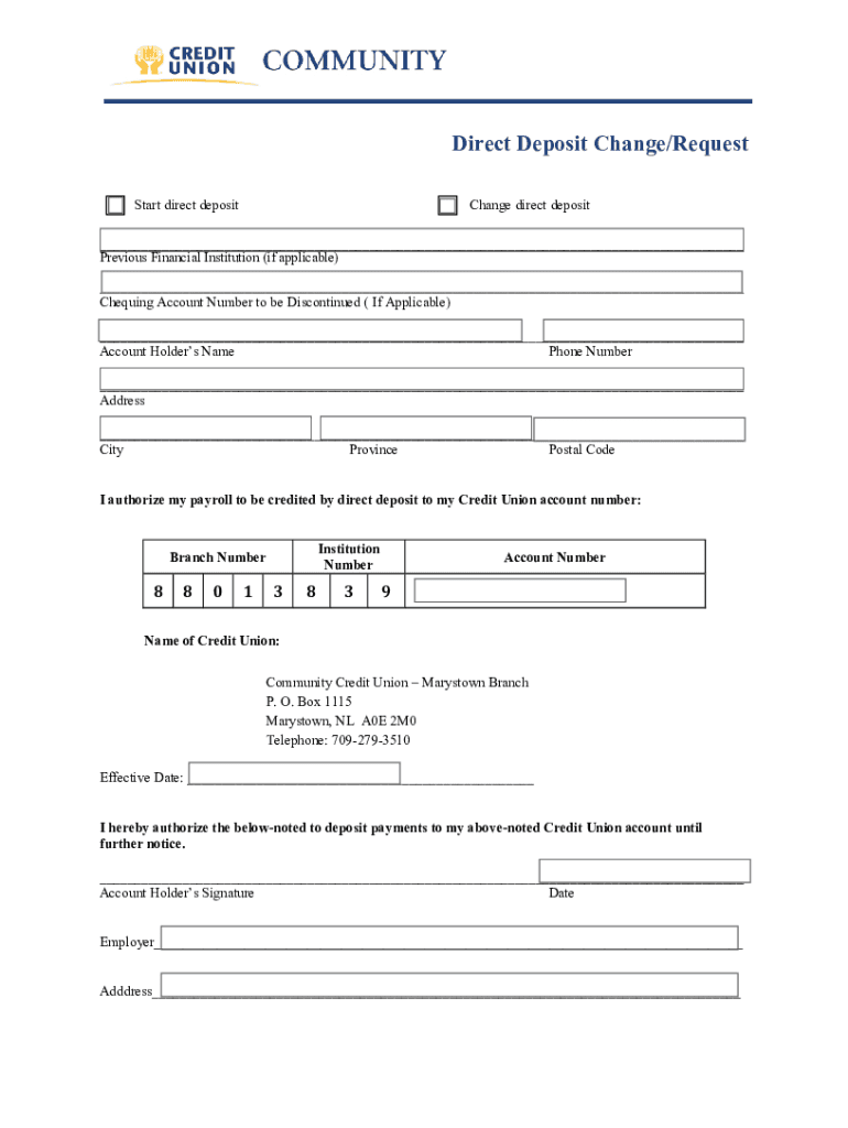 Direct Deposit Change/Request Start direct depositChange direct deposit___ Previous Financial Institution (if applicable) ___ Cheating Account Number to be Discontinued (If Applicable) ___ Account