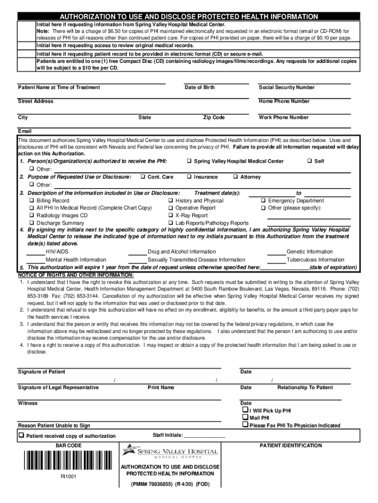 AUTHORIZATION TO USE AND DISCLOSE PROTECTED HEALTH INFORMATION Initial here if requesting information from Spring Valley Hospital Medical Center. Note: There will be a charge of $6.50 for copies of