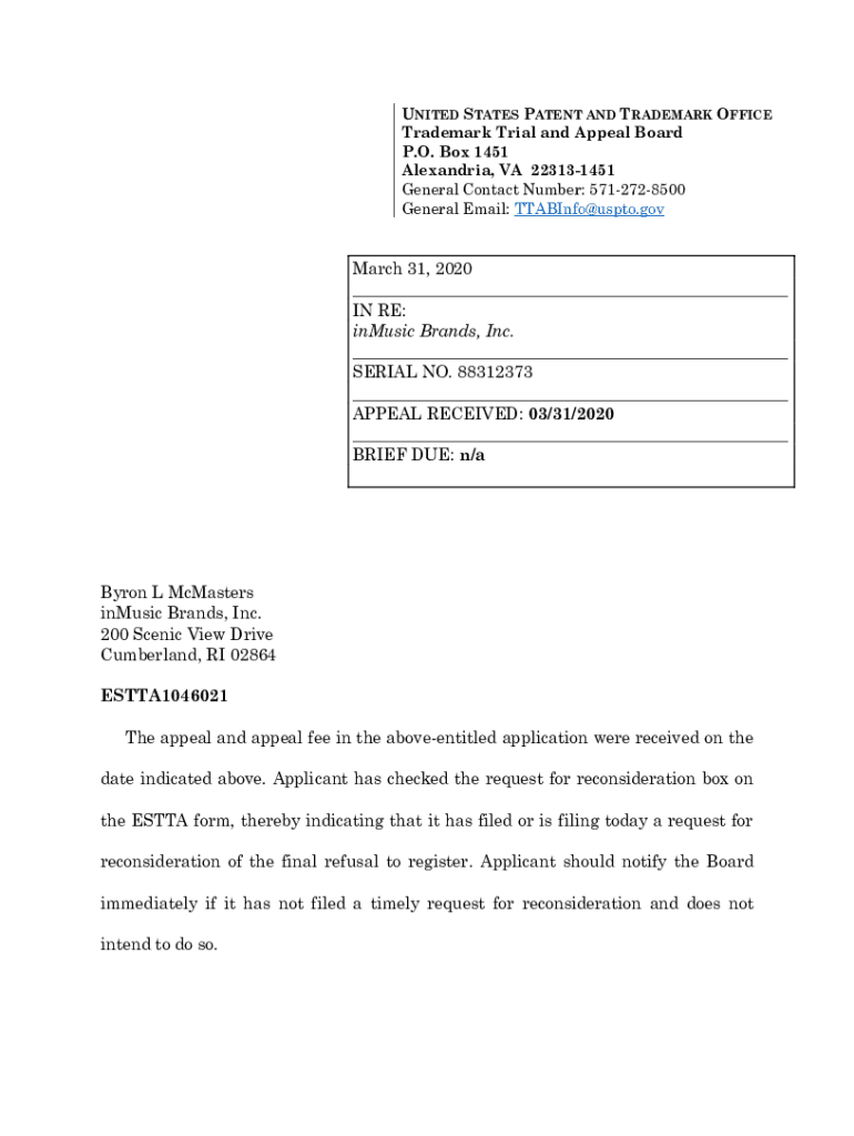 UNITED STATES PATENT AND TRADEMARK OFFICE Trademark Trial and Appeal Board P.O. Box 1451 Alexandria, VA 223131451 General Contact Number: 5712728500 General Email: TTABInfo@uspto.govMarch 31, 2020