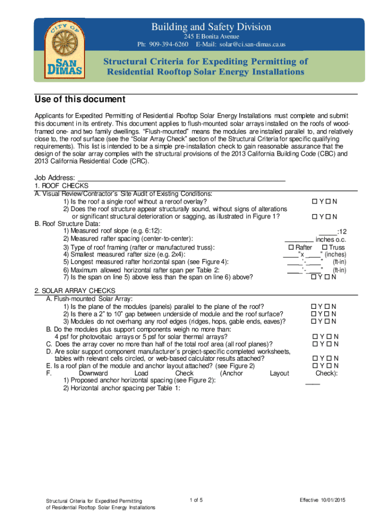 Building and Safety Division 245 E Bonita Avenue pH: 9093946260 Email: solar@ci.sandimas.ca.usUse of this document Applicants for Expedited Permitting of Residential Rooftop Solar Energy Installations