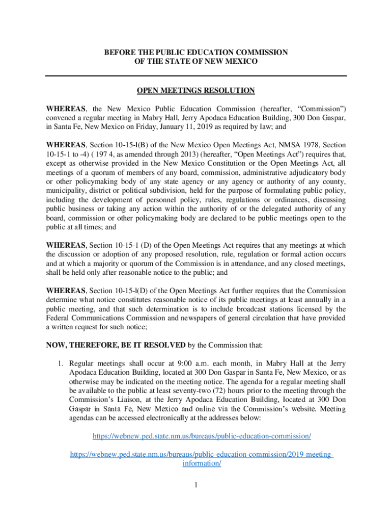 BEFORE THE PUBLIC EDUCATION COMMISSION OF THE STATE OF NEW MEXICOOPEN MEETINGS RESOLUTION WHEREAS, the New Mexico Public Education Commission (hereafter, Commission) convened a regular meeting in