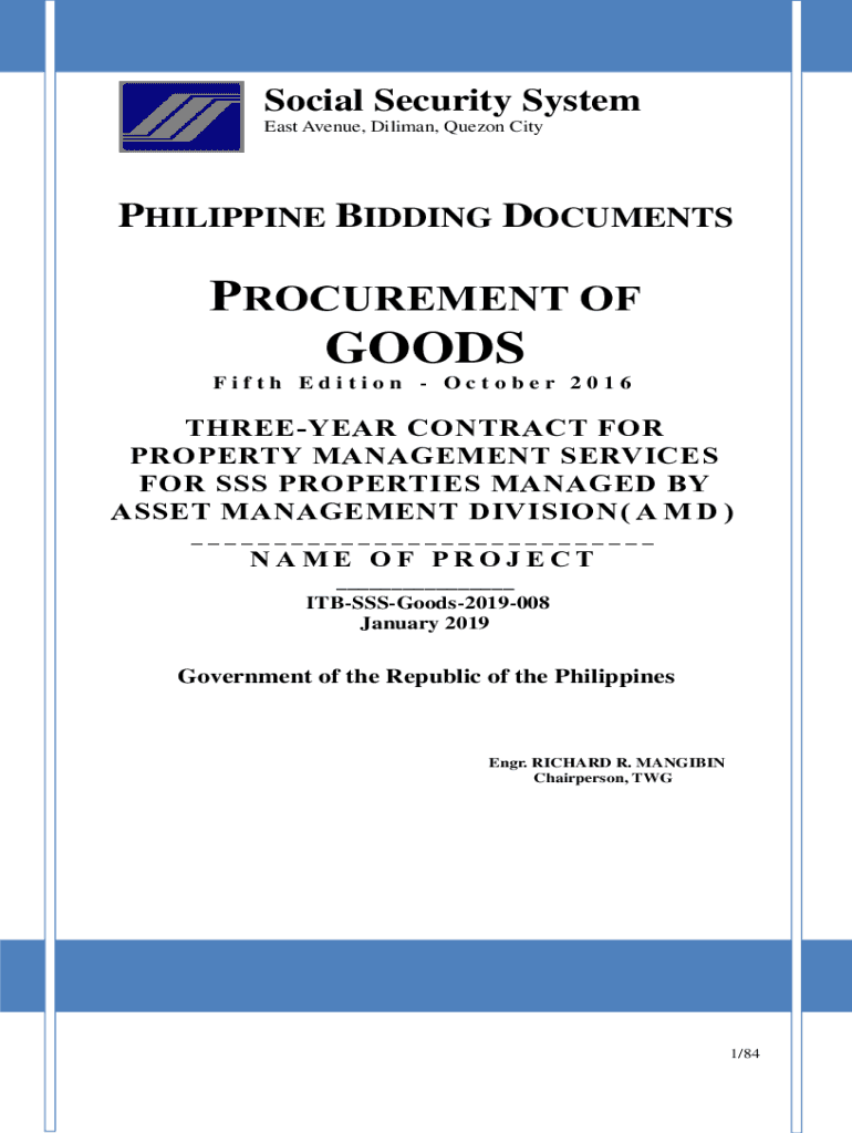 Social Security System East Avenue, Dalian, Quezon CityPHILIPPINE BIDDING DOCUMENTSPROCUREMENT OF GOODS Fifth Edition October 2016THREEYEAR CONTRACT FOR PROPERTY MANAGEMENT SERVICES FOR SSS PROPERTIES