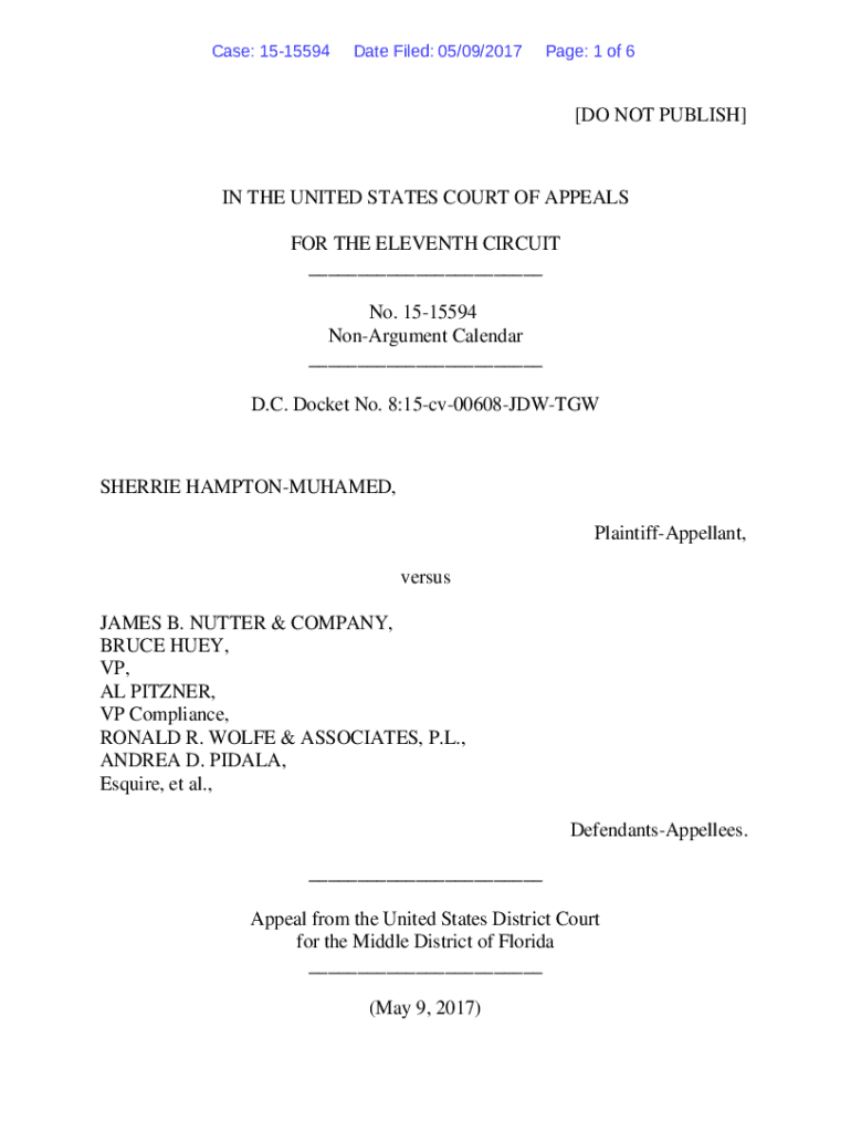 Case: 1515594Date Filed: 05/09/2017Page: 1 of 6[DO NOT PUBLISH]IN THE UNITED STATES COURT OF APPEALS FOR THE ELEVENTH CIRCUIT ___ No. 1515594 Argument Calendar ___ D.C. Docket No. 8:15cv00608JDWTGWSHERRIE