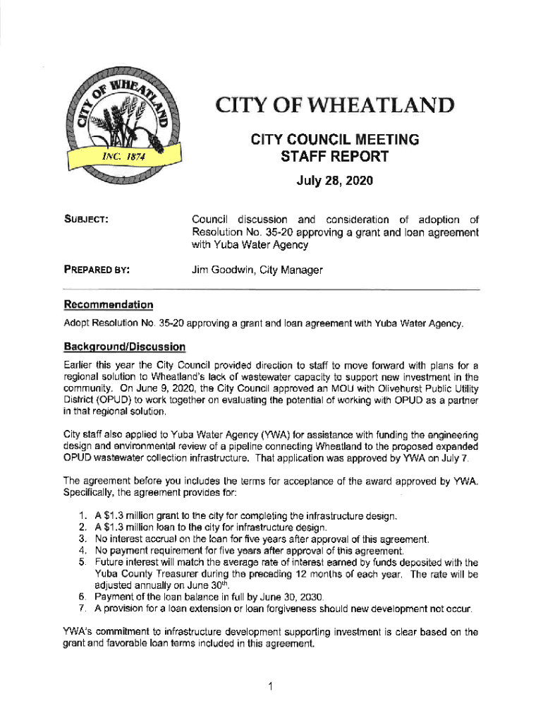 CITY OF WETLAND CITY COUNCIL MEETING STAFF REPORT July 28, 2020, SUBJECT:Council discussion and consideration of adoption of Resolution No. 3520 approving a grant and loan agreement with Cuba Water