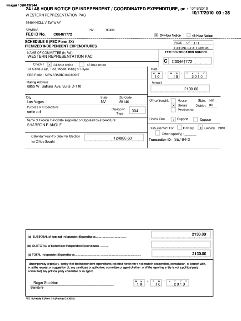 Image# 1099142734424 / 48-HOUR NOTICE OF INDEPENDENT / COORDINATED EXPENDITURE, on : 10/16/2010 10/17/2010 00 : 35 WESTERN REPRESENTATION PAC 5549 KNOLL VIEW WAY SPARKS FEC ID No.NV89436C00461772X