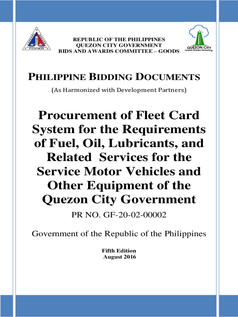 REPUBLIC OF THE PHILIPPINES QUEZON CITY GOVERNMENT BIDS AND AWARDS COMMITTEE GOODSPHILIPPINE BIDDING DOCUMENTS (As Harmonized with Development Partners)Procurement of Fleet Card System for the Requirements