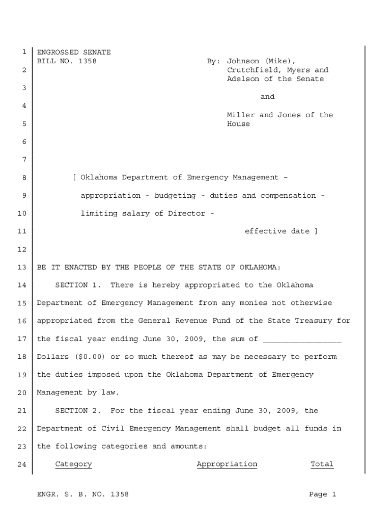 1ENGROSSED SENATE BILL NO. 13582By: Johnson (Mike), Crutch field, Myers and Abelson of the Senate3 and 4 Miller and Jones of the House5 6 7 8 9 10[Oklahoma Department of Emergency Management appropriation