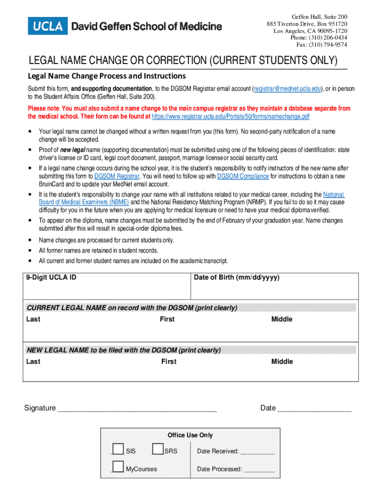 Geffen Hall, Suite 200 885 Riverton Drive, Box 951720 Los Angeles, CA 900951720 Phone: (310) 2060434 Fax: (310) 7949574LEGAL NAME CHANGE OR CORRECTION (CURRENT STUDENTS ONLY) Legal Name Change Process
