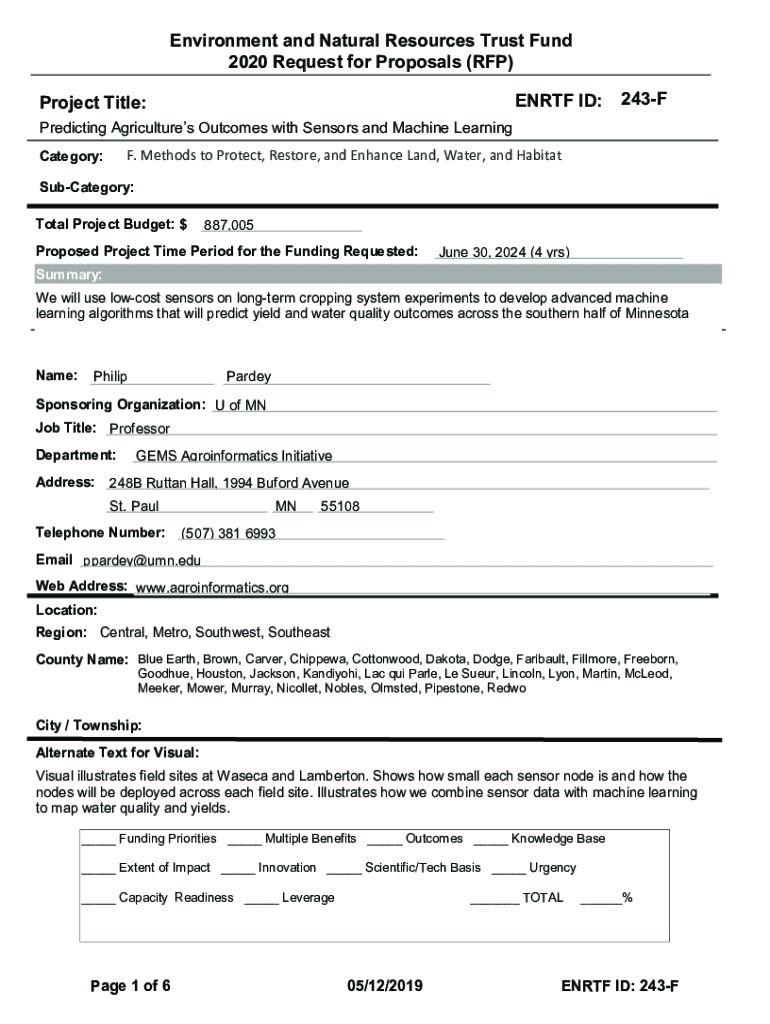 Environment and Natural Resources Trust Fund 2020 Request for Proposals (RFP) EN RTF ID:Project Title:243FPredicting Agriculture's Outcomes with Sensors and Machine Learning F. Methods to Protect,