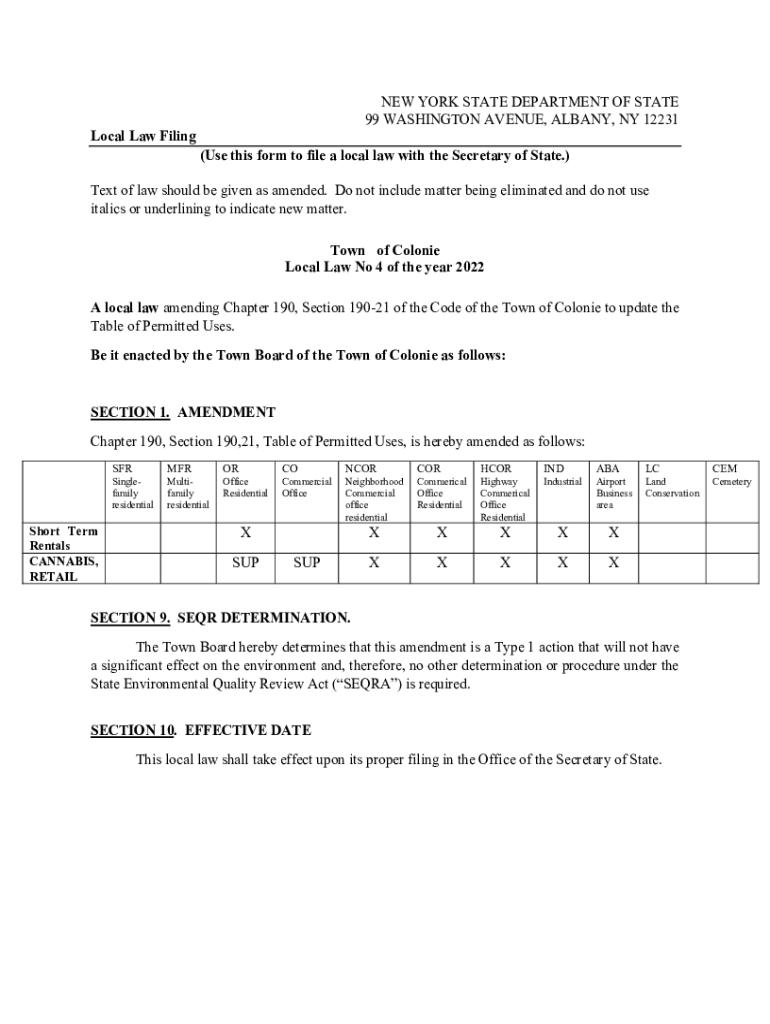 NEW YORK STATE DEPARTMENT OF STATE 99 WASHINGTON AVENUE, ALBANY, NY 12231 Local Law Filing (Use this form to file a local law with the Secretary of State.) Text of law should be given as amended.