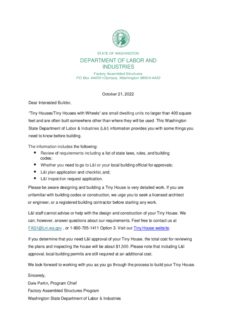 STATE OF WASHINGTONDEPARTMENT OF LABOR AND INDUSTRIES Factory Assembled Structures PO Box 44430 Olympia, Washington 985044430October 21, 2022 Dear Interested Builder, \” Tiny Houses/Tiny Houses